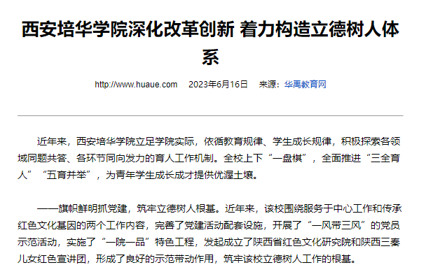 近年来,西安培华学院立足学院实际,依循教育规律、学生成长规律,积极探索各领域同题共答、各环节同向发力的育人工作机制。全校上下“一盘棋”,全面推进“三全育人”“五育并举”,为青年学生成长成才提供优渥土壤。