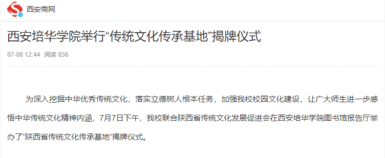 为深入挖掘中华优秀传统文化,落实立德树人根本任务,加强我校校园文化建设,让广大师生进一步感悟中华传统文化精神内涵,7月7日下午,我校联合陕西省传统文化发展促进会在西安培华学院图书馆报告厅举办了“陕西省传统文化传承基地”揭牌仪式。