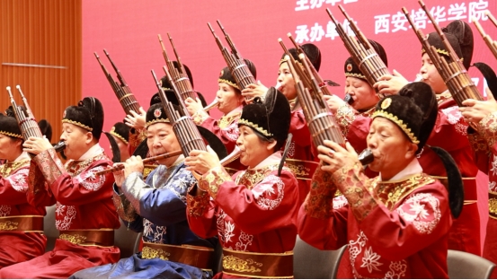 第二阶段揭牌仪式正式开始前,西安都城隍庙鼓乐社身着华服,以高超的演奏技巧为现场师生带来一首经典曲目《步步娇》,让人们沉浸在典雅大气的鼓乐之中,感受灵魂的洗礼与精神的升华,引得现场掌声阵阵。