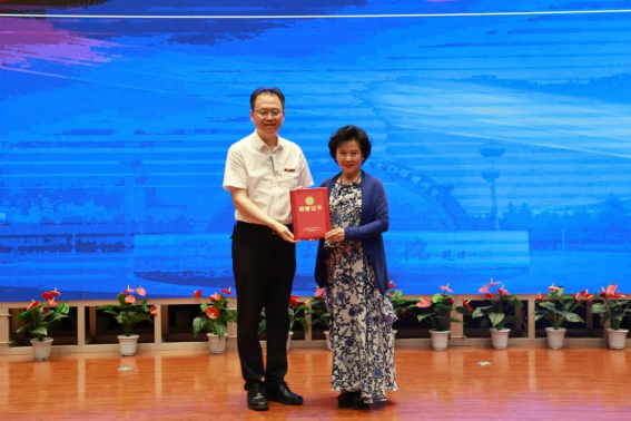 陕西广播电视台著名资深节目主持人、陕西省传统文化发展促进会会长陈爱美为西安培华学院颁发“副会长单位证书”,姜波理事长上台接受聘书