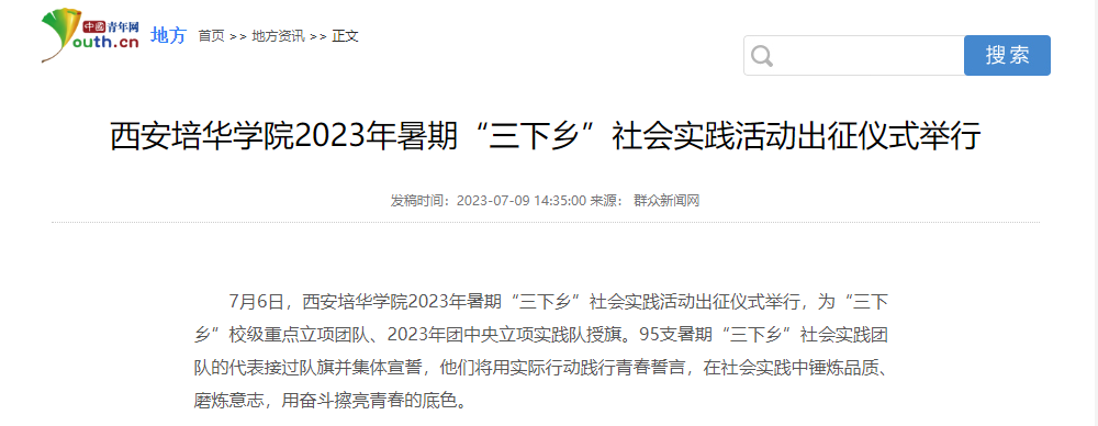7月6日,西安培华学院2023年暑期“三下乡”社会实践活动出征仪式举行,为“三下乡”校级重点立项团队、2023年团中央立项实践队授旗。95支暑期“三下乡”社会实践团队的代表接过队旗并集体宣誓,他们将用实际行动践行青春誓言,在社会实践中锤炼品质、磨炼意志,用奋斗擦亮青春的底色。