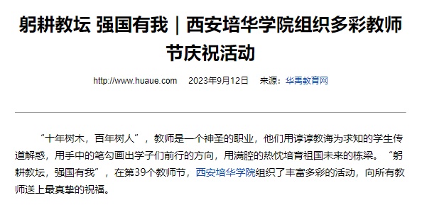 “十年树木,百年树人”,教师是一个神圣的职业,他们用谆谆教诲为求知的学生传道解惑,用手中的笔勾画出学子们前行的方向,用满腔的热忱培育祖国未来的栋梁。“躬耕教坛,强国有我”,在第39个教师节,西安培华学院组织了丰富多彩的活动,向所有教师送上最真挚的祝福。