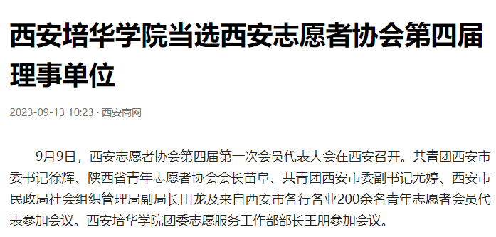9月9日,西安志愿者协会第四届第一次会员代表大会在西安召开。共青团西安市委书记徐辉、陕西省青年志愿者协会会长苗阜、共青团西安市委副书记尤婷、西安市民政局社会组织管理局副局长田龙及来自西安市各行各业200余名青年志愿者会员代表参加会议。西安培华学院团委志愿服务工作部部长王朋参加会议。