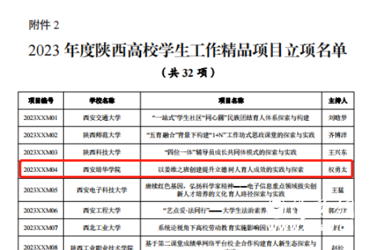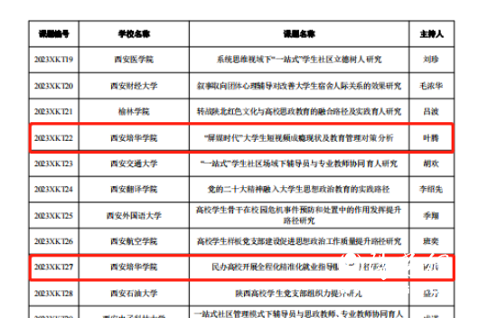 9月5日,中共陕西省委教育工委发布了《关于公布2023年度陕西高校学生工作精品项目和研究课题立项名单的通知》,学校党委学工部副部长权勇太主持的《以姜维之班创建提升立德树人育人成效的实践与探索》获精品项目立项;学生潜能发展中心叶腾老师主持的《“屏媒时代”大学生短视频成瘾现状及教育管理对策分析》获学生工作研究课题立项;人文与国际教育学院党委书记兼副院长南兵主持的《民办高校开展全程化精准化就业指导服务的路径研究》获学生工作研究课题立项。