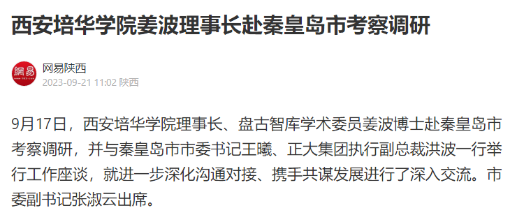9月17日,西安培华学院理事长、盘古智库学术委员姜波博士赴秦皇岛市考察调研,并与秦皇岛市市委书记王曦、正大集团执行副总裁洪波一行举行工作座谈,就进一步深化沟通对接、携手共谋发展进行了深入交流。市委副书记张淑云出席。