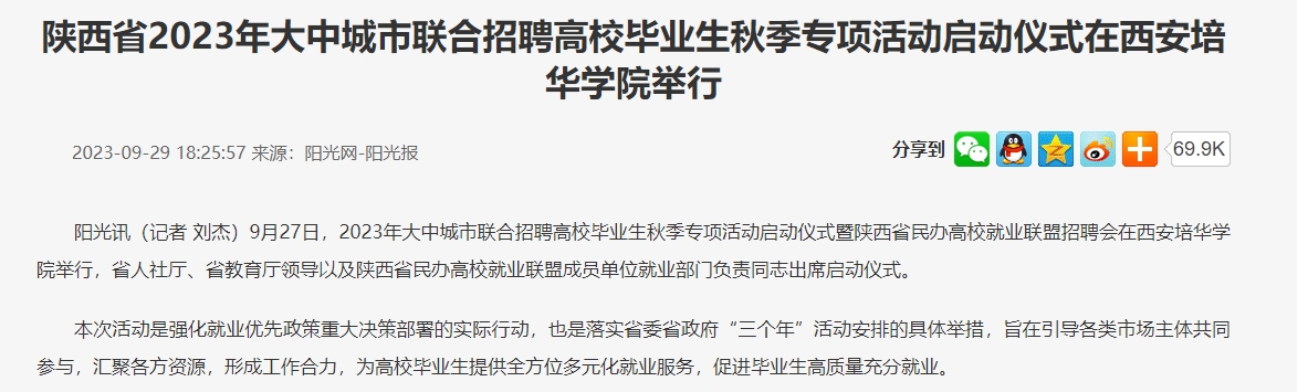阳光讯(记者 刘杰)9月27日,2023年大中城市联合招聘高校毕业生秋季专项活动启动仪式暨陕西省民办高校就业联盟招聘会在西安培华学院举行,省人社厅、省教育厅领导以及陕西省民办高校就业联盟成员单位就业部门负责同志出席启动仪式。