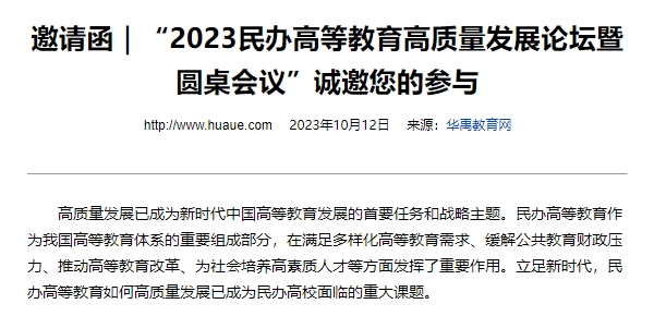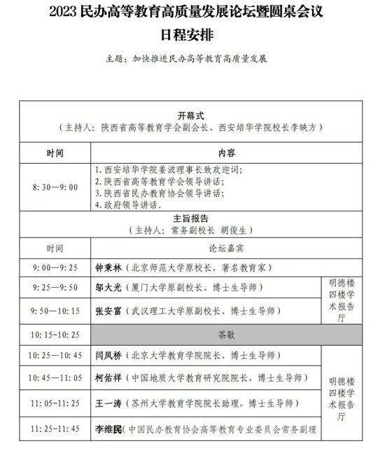 为推动民办高等教育高质量发展,陕西省高等教育学会、陕西省民办教育协会、西安培华学院将于10月22日联合举办“2023民办高等教育高质量发展论坛暨圆桌会议”(以下简称“论坛”)。在培华建校95周年之际,通过本次论坛,旨在搭建一个学术交流平台,汇聚高等教育专家学者、民办高校负责人、行业企业专家等,分享办学经验、探讨发展路径,形成提升民办高等教育高质量发展的策略。我们诚挚邀请民办高校董事长(理事长)、校长,高等教育专家学者出席此次盛会。您的出席将为本次论坛增添更多的精彩与深度,为与会嘉宾带来全新的启示和思考。