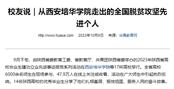 9月下旬,由陕西省委教育工委、省教育厅、共青团陕西省委举办的2023年陕西省高校毕业生建功立业先进事迹报告系列活动在西安培华学院等17所高校举行。全省高校6000余名师生在现场参与,47.9万人在线上关注或收看,活动在广大师生中引起热烈反响。14名陕西高校的优秀毕业生分享了他们扎根基层、报效祖国、服务人民的奋斗故事。