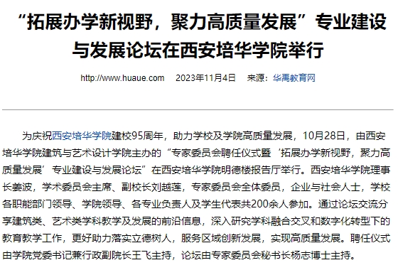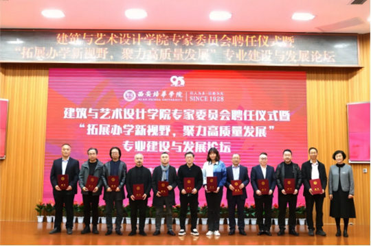 为庆祝西安培华学院建校95周年,助力学校及学院高质量发展,10月28日,由西安培华学院建筑与艺术设计学院主办的“专家委员会聘任仪式暨‘拓展办学新视野,聚力高质量发展’专业建设与发展论坛”在西安培华学院明德楼报告厅举行。西安培华学院理事长姜波,学术委员会主席、副校长刘越莲,专家委员会全体委员,企业与社会人士,学校各职能部门领导、学院领导、各专业负责人及学生代表共200余人参加。通过论坛交流分享建筑类、艺术类学科教学及发展的前沿信息,深入研究学科融合交叉和数字化转型下的教育教学工作,更好助力落实立德树人,服务区域创新发展,实现高质量发展。聘任仪式由学院党委书记兼行政副院长王飞主持,论坛由专家委员会秘书长杨志博士主持。