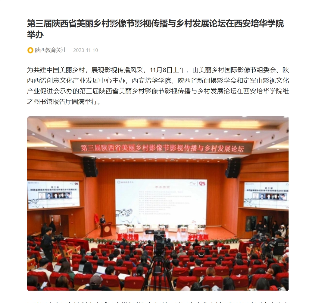 为共建中国美丽乡村,展现影视传播风采,11月8日上午,由美丽乡村国际影像节组委会、陕西西诺创意文化产业发展中心主办,西安培华学院、陕西省新闻摄影学会和定军山影视文化产业促进会承办的第三届陕西省美丽乡村影像节影视传播与乡村发展论坛在西安培华学院维之图书馆报告厅圆满举行。
