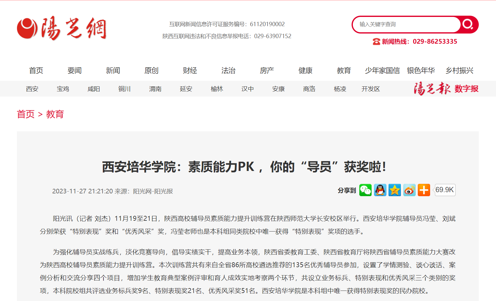 11月19至21日,陕西高校辅导员素质能力提升训练营在陕西师范大学长安校区举行。西安培华学院辅导员冯莹、刘斌分别荣获“特别表现”奖和“优秀风采”奖,冯莹老师也是本科组同类院校中唯一获得“特别表现”奖项的选手。