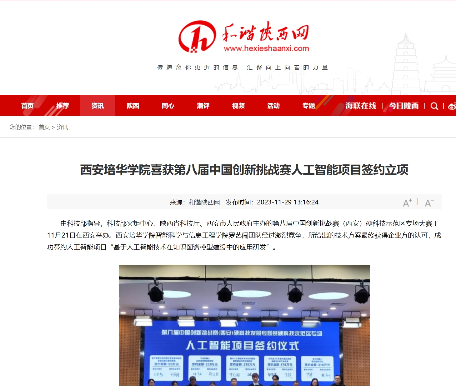 由科技部指导,科技部火炬中心、陕西省科技厅、西安市人民政府主办的第八届中国创新挑战赛(西安)硬科技示范区专场大赛于11月21日在西安举办。西安培华学院智能科学与信息工程学院罗艺闯团队经过激烈竞争,所给出的技术方案最终获得企业方的认可,成功签约人工智能项目“基于人工智能技术在知识图谱模型建设中的应用研发”。
