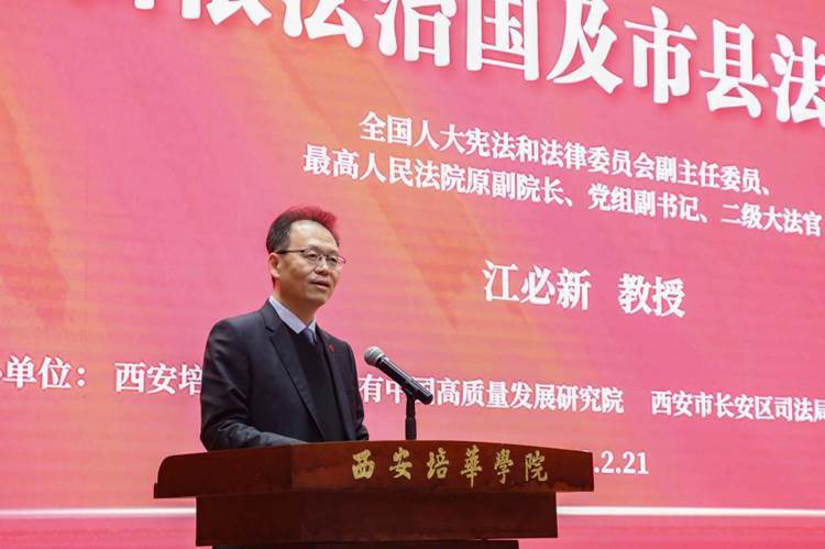 2月21日,著名法学家,第十三届全国人民代表大会宪法和法律委员会副主任委员、最高人民法院原党组副书记、副院长,二级大法官江必新教授莅临西安培华学院,作题为《全面依法治国及市县法治建设》的专题讲座。此次讲座旨在帮助省、市、区、县司法干部及培华学院师生更好地学习领会党的精神和法治思想,深刻理解法治文化起源及制度。