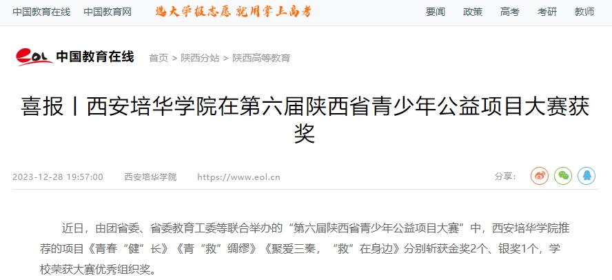 近日,由团省委、省委教育工委等联合举办的“第六届陕西省青少年公益项目大赛”中,西安培华学院推荐的项目《青春“健”长》《青“救”绸缪》《聚爱三秦,“救”在身边》分别斩获金奖2个、银奖1个,西安培华学院荣获大赛优秀组织奖。