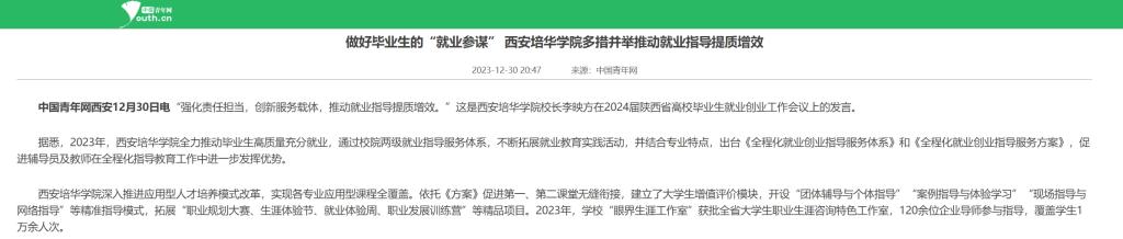 据悉,2023年,西安培华学院全力推动毕业生高质量充分就业,通过校院两级就业指导服务体系,不断拓展就业教育实践活动,并结合专业特点,出台《全程化就业创业指导服务体系》和《全程化就业创业指导服务方案》,促进辅导员及教师在全程化指导教育工作中进一步发挥优势。