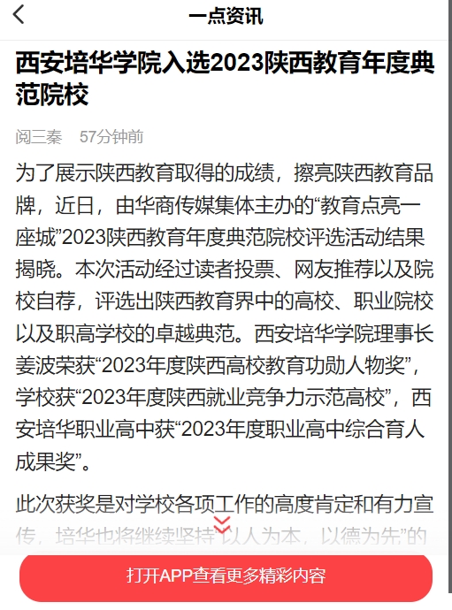 为了展示陕西教育取得的成绩,擦亮陕西教育品牌,近日,由华商传媒集体主办的“教育点亮一座城”2023陕西教育年度典范院校评选活动结果揭晓。本次活动经过读者投票、网友推荐以及院校自荐,评选出陕西教育界中的高校、职业院校以及职高学校的卓越典范。西安培华学院理事长姜波荣获“2023年度陕西高校教育功勋人物奖”,学校获“2023年度陕西就业竞争力示范高校”,西安培华职业高中获“2023年度职业高中综合育人成果奖”。