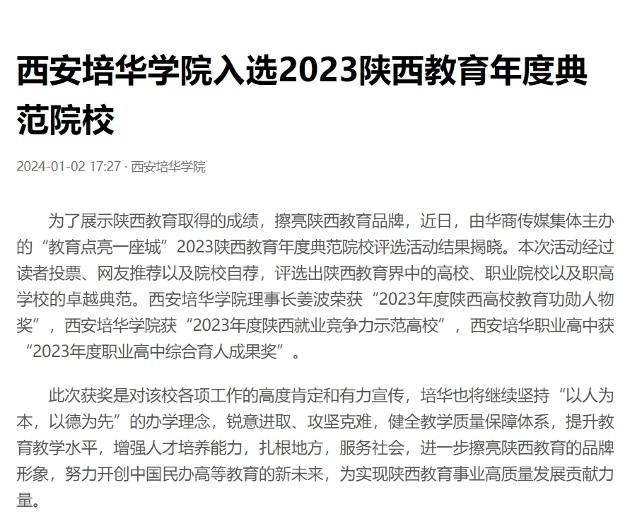 为了展示陕西教育取得的成绩,擦亮陕西教育品牌,近日,由华商传媒集体主办的“教育点亮一座城”2023陕西教育年度典范院校评选活动结果揭晓。本次活动经过读者投票、网友推荐以及院校自荐,评选出陕西教育界中的高校、职业院校以及职高学校的卓越典范。西安培华学院理事长姜波荣获“2023年度陕西高校教育功勋人物奖”,西安培华学院获“2023年度陕西就业竞争力示范高校”,西安培华职业高中获“2023年度职业高中综合育人成果奖”。
