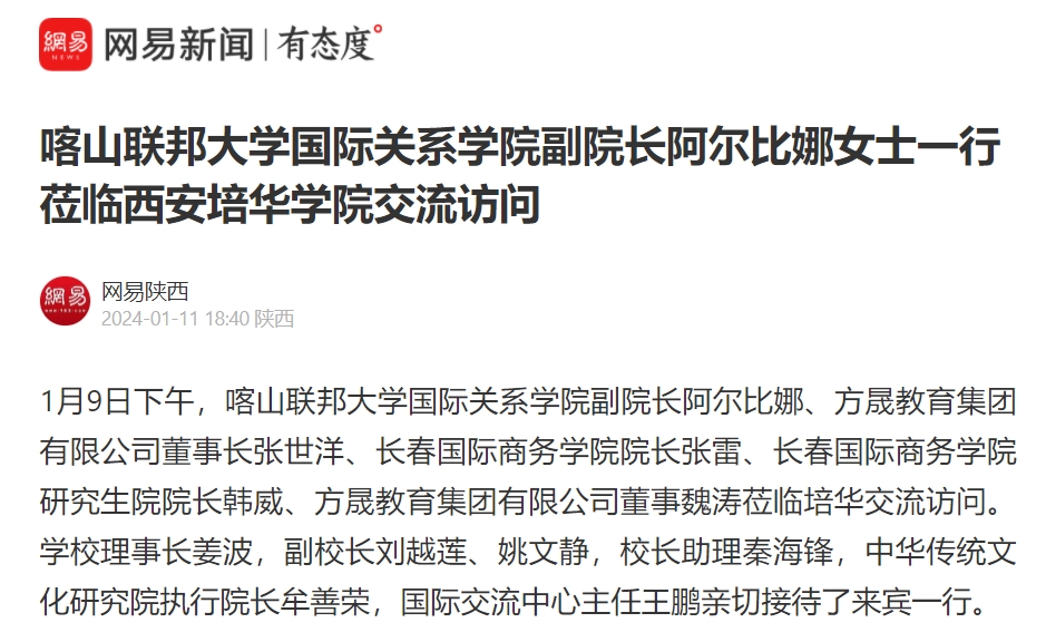 1月9日下午,喀山联邦大学国际关系学院副院长阿尔比娜、方晟教育集团有限公司董事长张世洋、长春国际商务学院院长张雷、长春国际商务学院研究生院院长韩威、方晟教育集团有限公司董事魏涛莅临培华交流访问。学校理事长姜波,副校长刘越莲、姚文静,校长助理秦海锋,中华传统文化研究院执行院长牟善荣,国际交流中心主任王鹏亲切接待了来宾一行。
