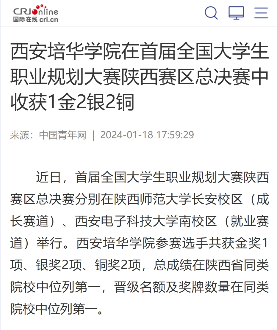 本次大赛以“筑梦青春志在四方 规划启航职引未来”为主题。陕西省93所高校超39.5万名学生参与了此次大赛,最终有200名选手入围陕西赛区总决赛。决赛分为“现场陈述”“评委提问(综合面试)”“天降(实习)offer”等多个环节,经过角逐,西安培华学院分别获得成长赛道高教组决赛金银奖、就业赛道高职组决赛银奖、就业赛道高教组决赛铜奖。
