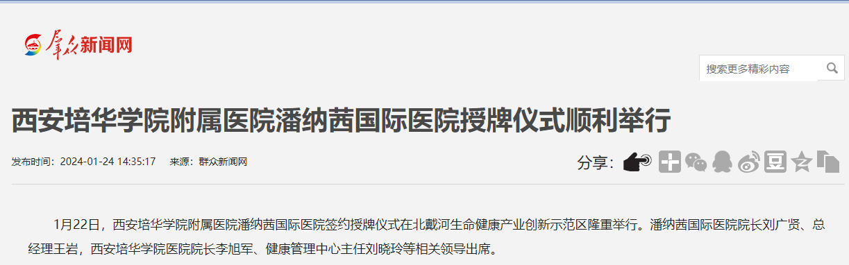 1月22日,西安培华学院附属医院潘纳茜国际医院签约授牌仪式在北戴河生命健康产业创新示范区隆重举行。潘纳茜国际医院院长刘广贤、总经理王岩,西安培华学院医院院长李旭军、健康管理中心主任刘晓玲等相关领导出席。