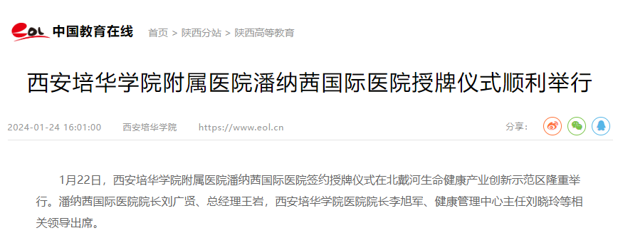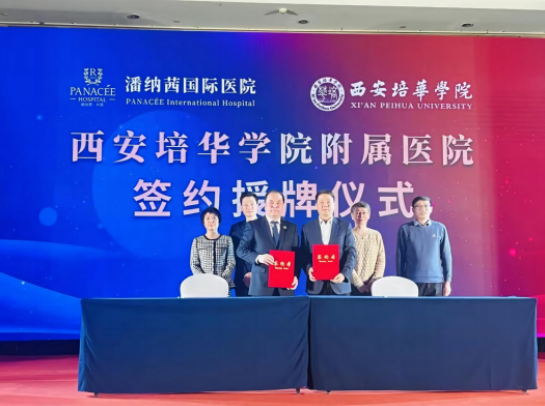 1月22日,西安培华学院附属医院潘纳茜国际医院签约授牌仪式在北戴河生命健康产业创新示范区隆重举行。潘纳茜国际医院院长刘广贤、总经理王岩,西安培华学院医院院长李旭军、健康管理中心主任刘晓玲等相关领导出席。