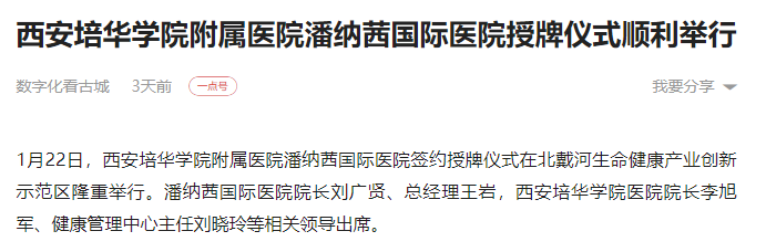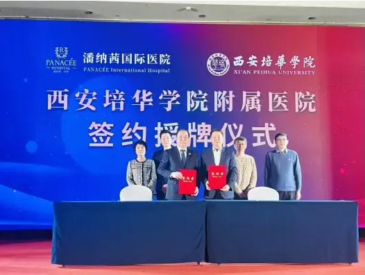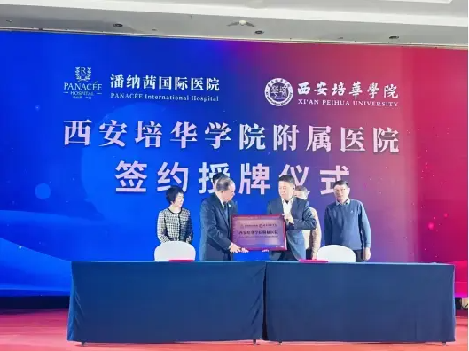 1月22日,西安培华学院附属医院潘纳茜国际医院签约授牌仪式在北戴河生命健康产业创新示范区隆重举行。潘纳茜国际医院院长刘广贤、总经理王岩,西安培华学院医院院长李旭军、健康管理中心主任刘晓玲等相关领导出席。