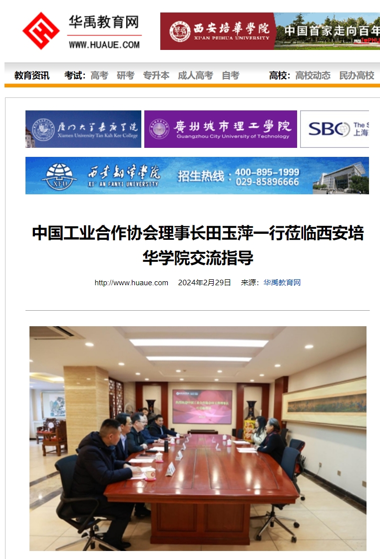 2月22日,中国工业合作协会理事长田玉萍及中国工业合作协会培训部主任刘敏莅临西安培华学院指导工作,并在该校明德楼五楼会议室进行交流座谈。