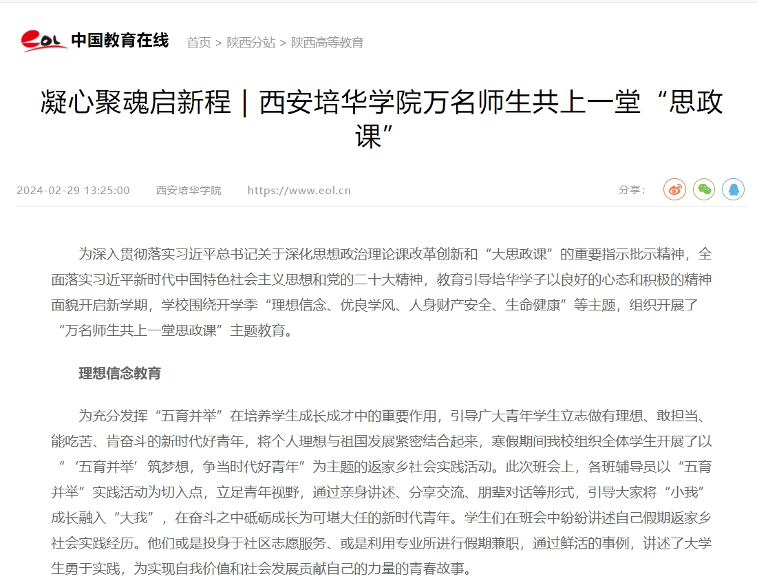 为教育引导培华学子以良好的心态和积极的精神面貌开启新学期,西安培华学院围绕开学季“理想信念、优良学风、人身财产安全、生命健康”等主题,组织开展了“万名师生共上一堂思政课”主题教育活动。