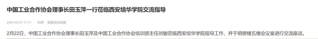2月22日,中国工业合作协会理事长田玉萍及中国工业合作协会培训部主任刘敏莅临西安培华学院指导工作,并在该校明德楼五楼会议室进行交流座谈。