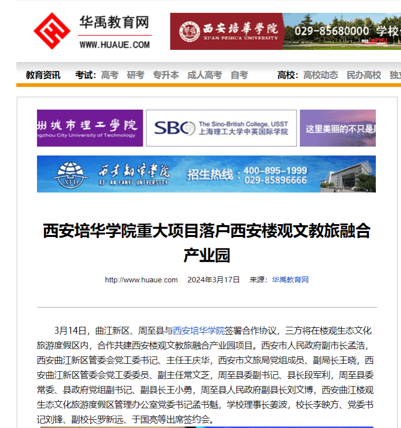 3月14日,曲江新区、周至县与西安培华学院签署合作协议,三方将在楼观生态文化旅游度假区内,合作共建西安楼观文教旅融合产业园项目。西安市人民政府副市长孟浩,西安曲江新区管委会党工委书记、主任王庆华,西安市文旅局党组成员、副局长王晓,西安曲江新区管委会党工委委员、副主任常文芝,周至县委副书记、县长段军利,周至县委常委、县政府党组副书记、副县长王小勇,周至县人民政府副县长刘文博,西安曲江楼观生态文化旅游度假区管理办公室党委书记孟书魁,学校理事长姜波,校长李映方、党委书记刘锋、副校长罗新远、于国亮等出席签约会。