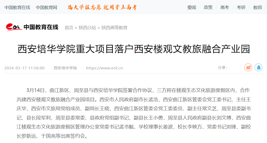 3月14日,曲江新区、周至县与西安培华学院签署合作协议,三方将在楼观生态文化旅游度假区内,合作共建西安楼观文教旅融合产业园项目。西安市人民政府副市长孟浩,西安曲江新区管委会党工委书记、主任王庆华,西安市文旅局党组成员、副局长王晓,西安曲江新区管委会党工委委员、副主任常文芝,周至县委副书记、县长段军利,周至县委常委、县政府党组副书记、副县长王小勇,周至县人民政府副县长刘文博,西安曲江楼观生态文化旅游度假区管理办公室党委书记孟书魁,学校理事长姜波,校长李映方、党委书记刘锋、副校长罗新远、于国亮等出席签约会。