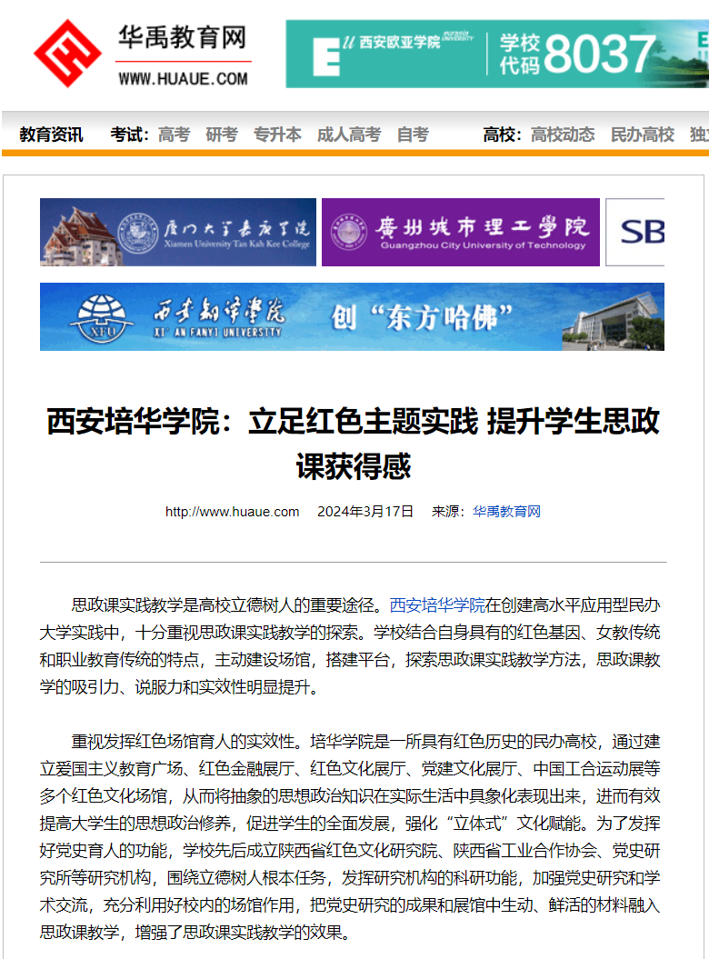 重视发挥红色场馆育人的实效性。培华学院是一所具有红色历史的民办高校。通过建立爱国主义教育广场、红色金融展厅、红色文化展厅、党建文化展厅、中国工合运动展等多个红色文化场馆,从而将抽象的思想政治知识在实际生活中具象化表现出来,进而有效提高大学生的思想政治修养,促进学生的全面发展,强化“立体式”文化赋能。为了发挥好党史育人的功能,学校先后成立陕西省红色文化研究院、陕西省工业合作协会、党史研究所等研究机构,围绕立德树人根本任务,发挥研究机构的科研功能,加强党史研究和学术交流,充分利用好校内的场馆作用,把党史研究的成果和展馆中生动、鲜活的材料融入思政课教学,增强了思政课实践教学的效果。