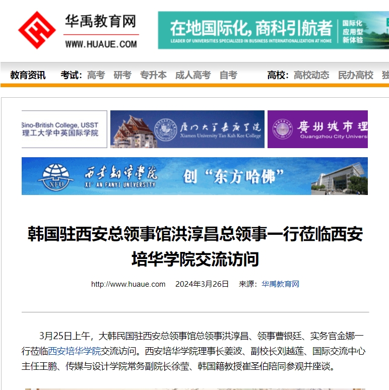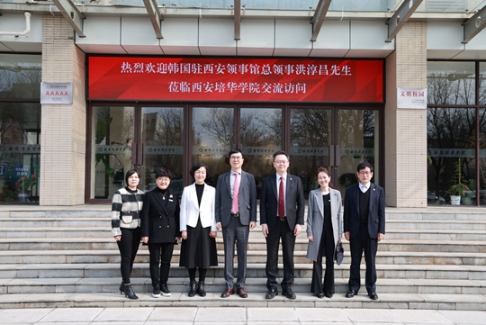 3月25日上午,大韩民国驻西安总领事馆总领事洪淳昌、领事曹银廷、实务官金娜一行莅临西安培华学院交流访问。西安培华学院理事长姜波、副校长刘越莲、国际交流中心主任王鹏、传媒与设计学院常务副院长徐莹、韩国籍教授崔圣伯陪同参观并座谈。