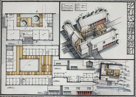 快题设计这门专业课也给邱烊骏带来了巨大的挑战,这门课要求在6小时内将设计思路和意图用徒手绘制的方式快速地表达出来,并完成一个能够反映设计思想和理念的设计成果。这也意味着他需要一整段完整的时间去练习,所以每个周末他都会把时间留给这门课。最初,画完这张近一米长的图,邱烊骏需要需近十个小时的时间。经过积累素材、大量的快题训练和复盘反思后,他总结出了自己的一套经验,终于可以在规定时间内完成一张高品质的快题设计手绘稿。
