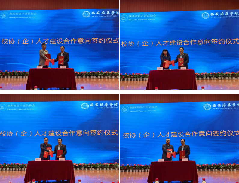 会上,陕西省资产评估协会分别与西安培华学院、陕西财经大学行知学院、西京学院签订了人才建设合作意向书;西安培华学院与正衡、新兰特、天健兴业、中和、金达、卓信大华、同道、旭隆、信通、天任十家资产评估公司签订了联培协议。