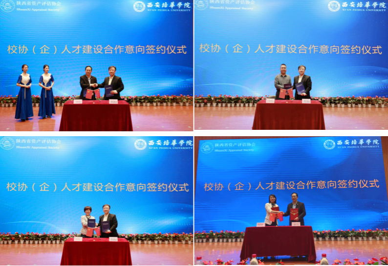 会上,陕西省资产评估协会分别与西安培华学院、陕西财经大学行知学院、西京学院签订了人才建设合作意向书;西安培华学院与正衡、新兰特、天健兴业、中和、金达、卓信大华、同道、旭隆、信通、天任十家资产评估公司签订了联培协议。