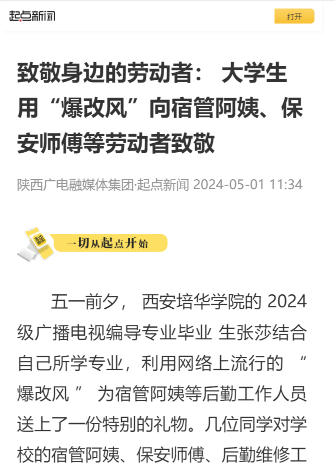 五一前夕, 西安培华学院的 2024 级广播电视编导专业毕业 生张莎结合自己所学专业,利用网络上流行的 “ 爆改风 ” 为宿管阿姨等后勤工作人员送上了一份特别的礼物。几位同学对学校的宿管阿姨、保安师傅、后勤维修工等共 13 名劳动者进行 “ 爆改 ”, 通过帮他们化妆、拍摄写真照的方式,为他们记录下最美瞬间,感谢他们在大学四年对大家校园生活保障的付出。