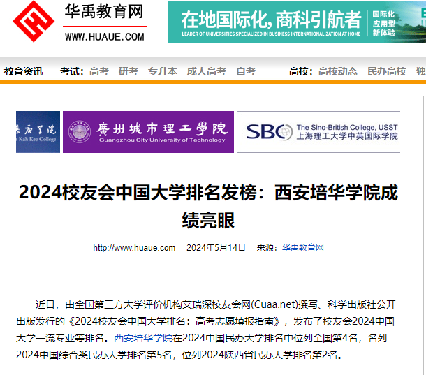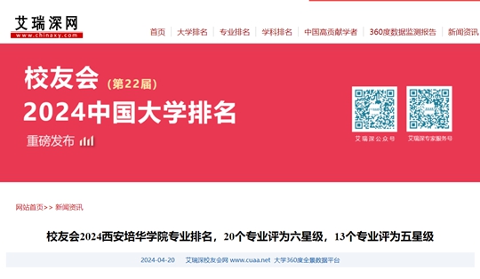 近日,由全国第三方大学评价机构艾瑞深校友会网(Cuaa.net)撰写、科学出版社公开出版发行的《2024校友会中国大学排名:高考志愿填报指南》,发布了校友会2024中国大学一流专业等排名。西安培华学院在2024中国民办大学排名中位列全国第4名,名列2024中国综合类民办大学排名第5名,位列2024陕西省民办大学排名第2名。