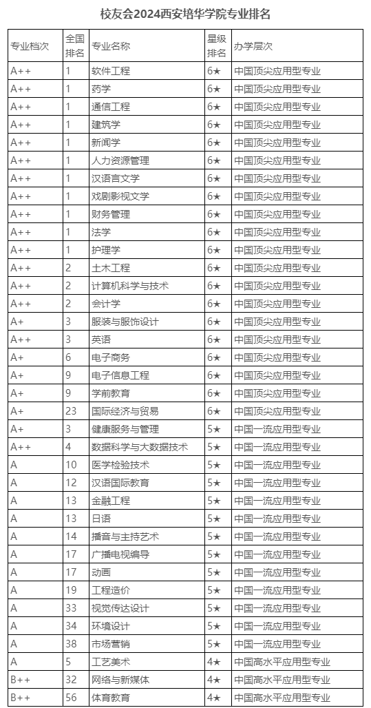 在校友会2024中国大学一流专业排名(应用型)中,西安培华学院位居全国第37名,共有20个专业评级为中国六星级专业(6★),13个专业评级为中国五星级专业(5★),3个专业评级为中国四星级专业(4★);在2024中国大学专业分档排名中,16个专业评为A++,6个专业评为A+,12个专业评为A,2个专业评为B++,位居全国同类高校前列。