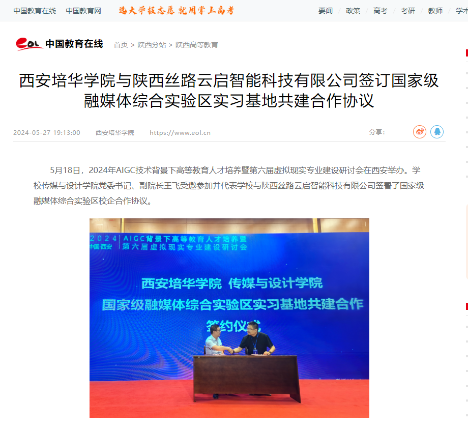 5月18日,2024年AIGC技术背景下高等教育人才培养暨第六届虚拟现实专业建设研讨会在西安举办。学校传媒与设计学院党委书记、副院长王飞受邀参加并代表学校与陕西丝路云启智能科技有限公司签署了国家级融媒体综合实验区校企合作协议。
