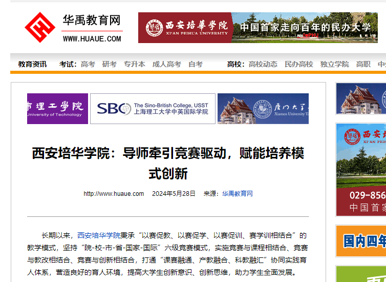 长期以来,西安培华学院秉承“以赛促教、以赛促学、以赛促训、赛学训相结合”的教学模式,坚持“院-校-市-省-国家-国际”六级竞赛模式,实施竞赛与课程相结合、竞赛与教改相结合、竞赛与创新相结合,打通“课赛融通、产教融合、科教融汇”协同实践育人体系,营造良好的育人环境,提高大学生创新意识、创新思维,助力学生全面发展。