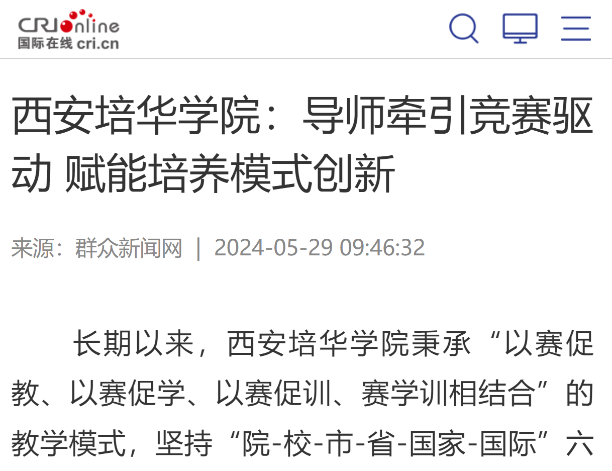 长期以来,西安培华学院秉承“以赛促教、以赛促学、以赛促训、赛学训相结合”的教学模式,坚持“院-校-市-省-国家-国际”六级竞赛模式,实施竞赛与课程相结合、竞赛与教改相结合、竞赛与创新相结合,打通“课赛融通、产教融合、科教融汇”协同实践育人体系,营造良好的育人环境,提高大学生创新意识、创新思维,助力学生全面发展。