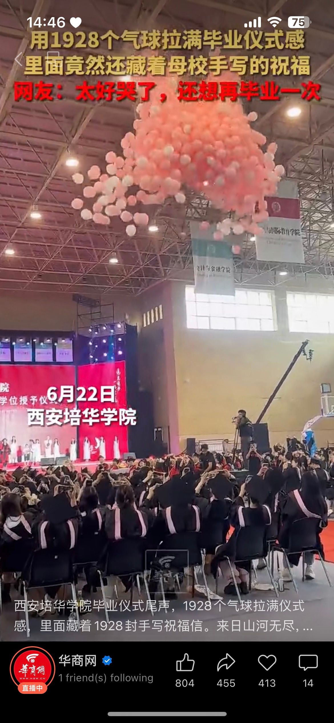 西安培华学院毕业仪式尾声,1928个气球拉满仪式感,里面藏着1928封手写祝福信。来日山河无尽,万里不负初心。