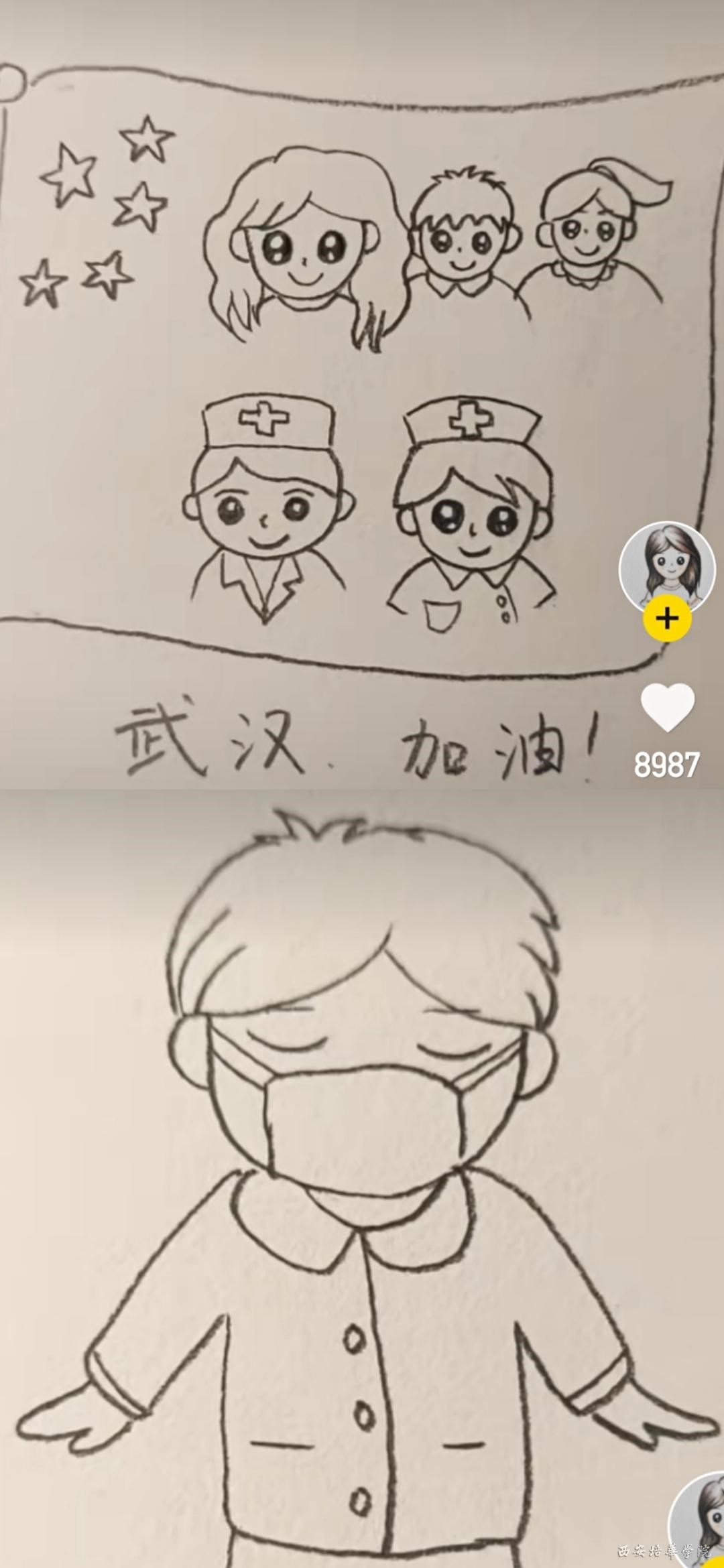 接下来由美术组的张莉星开始了以“以艺抗疫”为主题的美术学习活动,小朋友们对这次的主题认识也非常深刻,张莉星提出了“这副画应该送给谁”的问题,小朋友们稚嫩的语言表达出了对守护在一线岗位上的医生,警察、志愿者等人的感激。最后,张莉星给小朋友们提供了借鉴的绘画模板做参考。