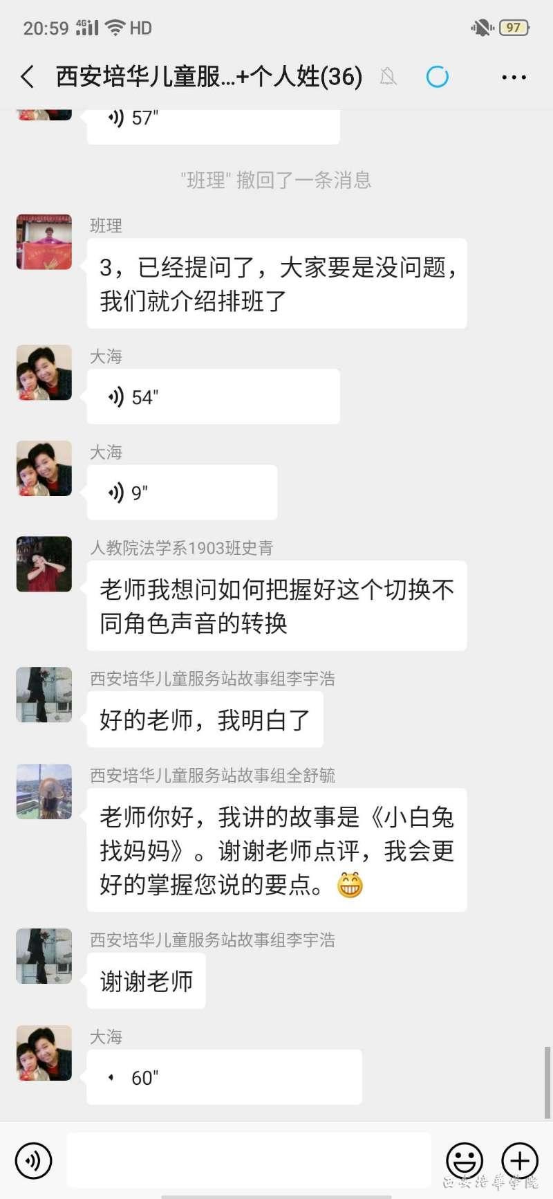 2020年2月18日,陕西省志愿服务联合会长、陕西省红凤工程志愿者协会志愿服务项目负责人、西安培华学院女子学院常务副院长班理带领培华学院女子学院儿童服务站的志愿者们采用线上传播的方式为皇甫村的小朋友举行了读故事、教绘画等活动、小朋友们也积极响应,营造了良好的学习氛围。本次活动的参与者分别是陕西省红凤工程志愿者协会的会长夏雨、小白鹭儿童服务站站长张会婷、小朱鹮儿童服务站的站长王敏及皇甫村妇联主席刘敏等2019级女子学院的44名同学,31名故事组,13名美工组。活动前期,我们特别邀请了我省著名播音指导、金话筒获奖者海茵老师,为大家进行了长达一个半小时的培训,大家受益匪浅。