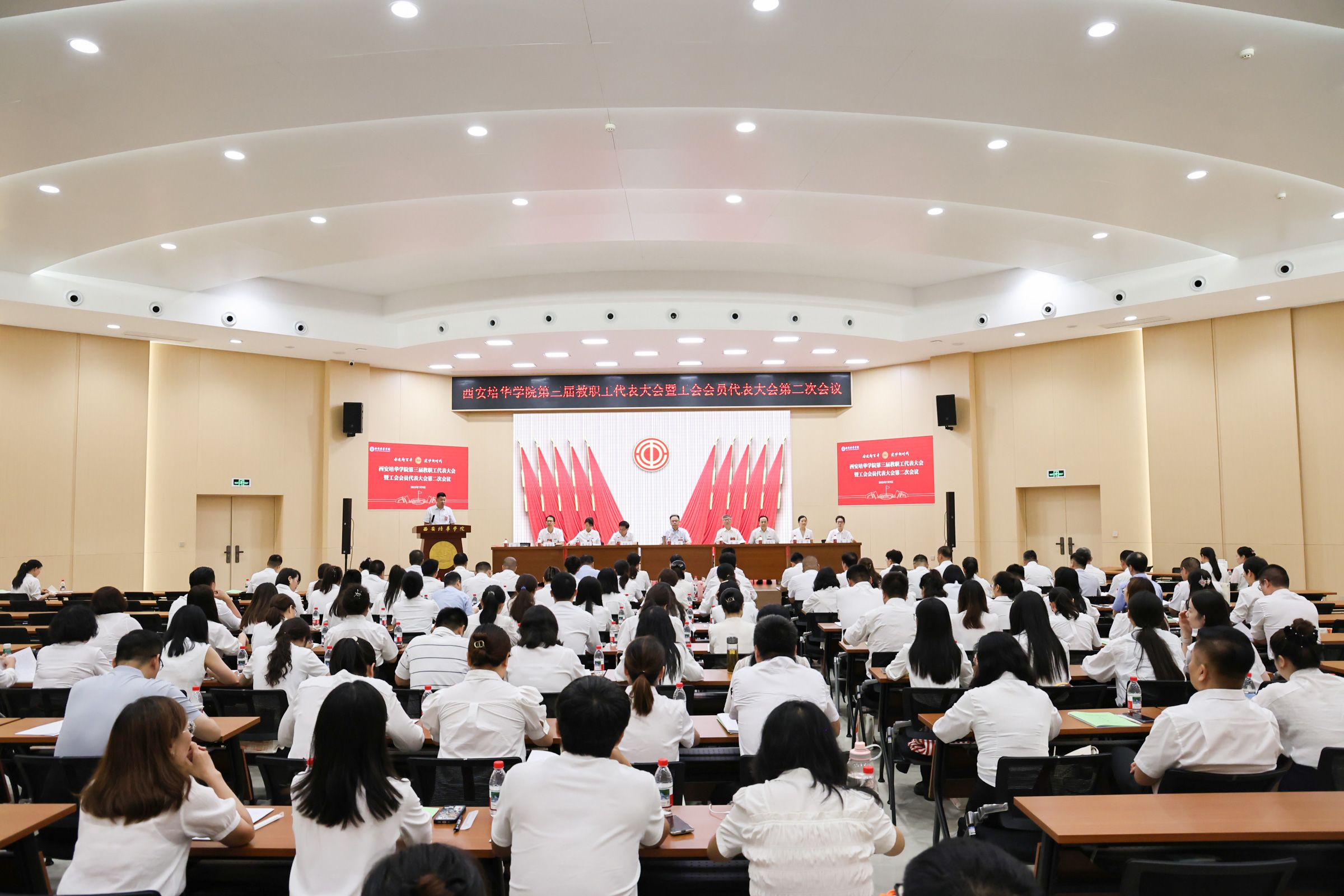 7月9日,西安培华学院第三届教职工代表大会暨工会会员代表大会第二次会议在长安校区明德楼报告厅召开。校领导、工会委员会委员、正式代表、列席人员及特邀嘉宾共130余人参加此次会议。会议由校党委副书记、工会副主席蔡亮主持。