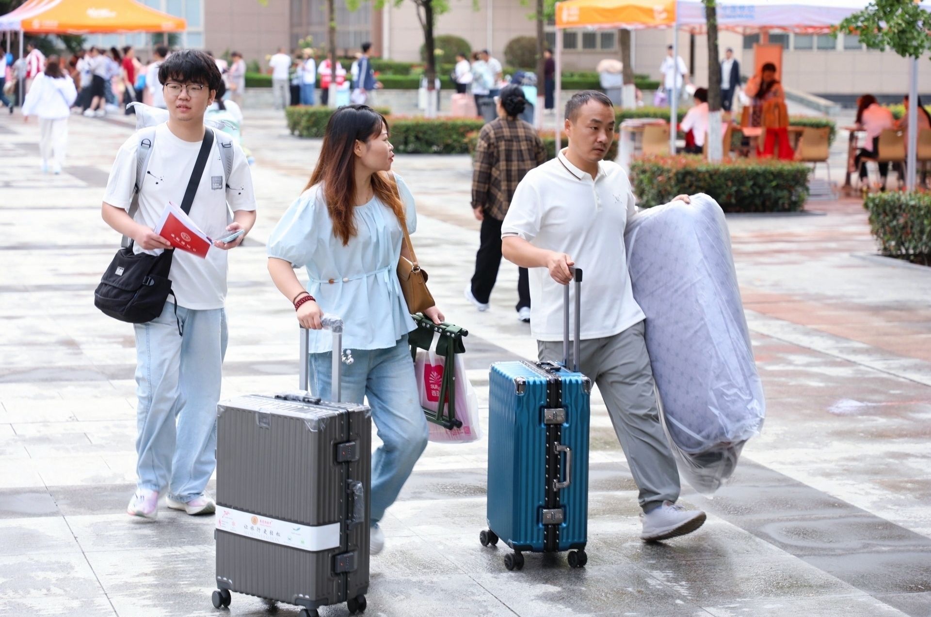校园里随处可见家长陪伴新生的身影,他们细心帮着孩子提行李。沉甸甸的行囊里,装着的不仅是生活用品,更是家人浓浓的关爱与不舍。