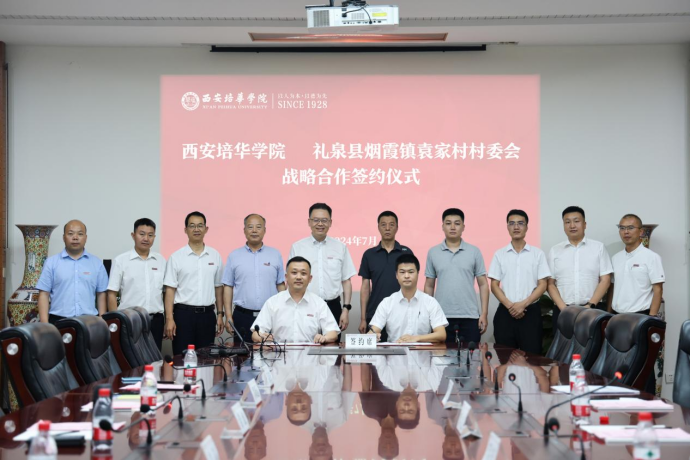 7月4日下午,西安培华学院与礼泉县袁家村战略合作签约仪式于明德楼第一会议室成功举行。全国人大代表、袁家村党支部书记郭占武,袁家村市场开发部负责人郭洪威,袁家村线上运营中心负责人酒润驰、袁家村曲江创意谷副店长董逍遥,西安培华学院理事长姜波,副校长罗新远,校长助理姜涛,合作发展中心主任柳雨、副主任刘斌,后勤服务中心主任张静远出席仪式。仪式由西安培华学院校长助理秦海锋主持。