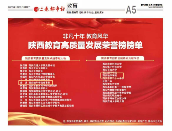 1月10日,《三秦都市报》教育版块发布了“非凡十年教育风华——陕西教育高质量发展荣誉榜榜单”评选结果,其中,西安培华学院理事长姜波荣获“陕西教育高质量发展卓越奉献人物”殊荣,西安培华学院荣获“陕西教育创新发展特别贡献学校”荣誉称号。