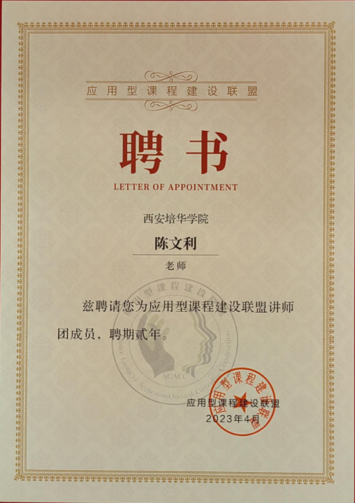智能科学与信息工程学院老师陈文利受聘为第三批联盟讲师团成员聘书